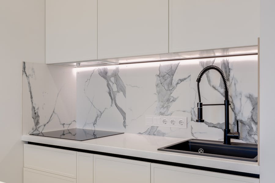 Pored drveta, kamen, mermer i keramika često se koriste za radne površine i zidne obloge. Mermerne radne ploče ne samo da izgledaju luksuzno već su i izuzetno dugotrajne. Keramičke pločice sa mat završnicom ili u svetlim tonovima doprinose čistom i sofisticiranom izgledu kuhinje.